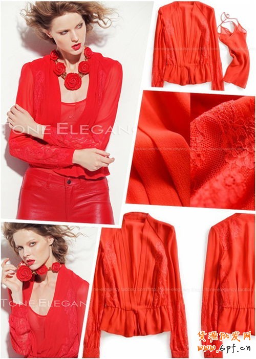 看慣了烈日下的清涼和夏季柔美的飄逸,一襲驚艷、純正的中國紅,加上呼之欲出、嬌艷欲滴的紅玫瑰,不得不說,這即是秋的信息,又是秋的時尚。設計理念大膽富有個性化,風格集冒險、色彩斑斕和吉普賽為一體,盡管是歐美范兒,卻也逃脫不了東方人追逐的眼光;凈色的模版,簡潔的風格以及麻豆動感的游走、媚惑的眼神,加之精心設計打造的玫瑰花項鏈的畫龍點睛??梢韵胂筮@樣的色彩與格調,專屬于搭配、情景與氛圍,一旦將其作為店鋪的主打商品置于首頁,即使不用文字,詩也早已成行;即使不用捉摸,香艷早已傳遞。