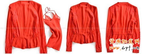 或許沒有哪個女人能抵擋的蕾絲誘惑,極具女人味的繡花蕾絲,華貴,性感而神秘,設計師將它巧妙拼接在衣身和雙袖上,精美的花紋,隱約透露的膚色,立即為整體增添了幾分嫵媚與浪漫。很有女人味的一款外套,名媛氣質。明艷的中國紅色與精致優雅的剪裁,結合柔軟的絲質面料,打造出輕盈飄逸而柔美的外觀。褶裥領襟設計,內置按扣,腰部縮褶,延伸下擺和內襯形成雙層褶皺荷葉擺的特色造型。當紅與粉、紅與藍不期而遇,偶爾的放縱或許就是奇遇的開始。玫瑰豈止是香艷:愛在深秋,故事還在繼續。
