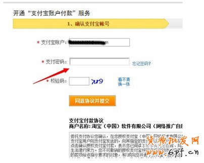 第五步,開通支付寶賬戶付款服務,然后輸入支付寶賬號和密碼,點擊同意協議并提交申請。提交后就完成了開通淘寶客推廣。(這協議是為以后成交產品扣除傭金需要用的。)