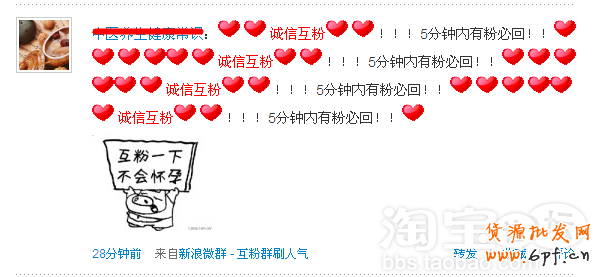 現(xiàn)在新浪每人每天的加粉上限大概是400以內(nèi),多了就不行了!所以我們要好好的利用這400個名額。我們不是名人,每天主動加粉是前期必做的事情。關(guān)于加粉的方法我們在上面已經(jīng)設(shè)置了標(biāo)簽,已經(jīng)有了目標(biāo)人群。所以我們就直接按標(biāo)簽去搜索加人。建議每天加到300人左右就可以了。在粉之前我們要先發(fā)一條關(guān)于誠信互粉的微博,以表決心,這樣人家才會信任你。如下圖: