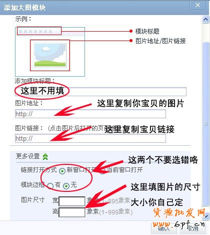 最后點擊確定一個模塊就成了,左側邊欄的圖和中間的大圖制作步驟是相同的,只是圖片大小不同。(有朋友問我圖片大小是怎么設置的,左邊欄里的是220*220的,其實大家自己慢慢試一下就知道了,很簡單的哦)寶貝分類也是一樣的!就是這么簡單,你學會了嗎?把各個圖片鏈接到你的店鋪首頁或者寶貝鏈接里面,趕快行動吧
