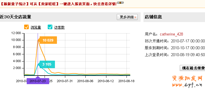 呵呵,這個淘寶量子統計是2010年7月17號才買的,價格不貴,好像一季才幾十塊。數據分析很全面,而且正好記錄了買家秀貼上幫派推薦位的這一周的井噴數據!23號貼子上推薦位的當天,貼子瀏覽量是近兩萬左右,店鋪流量是一萬多,店鋪銷售額是一萬多。大家請看下面這些數據截屏。這個瀏覽量和銷量的轉換率非常高哈!