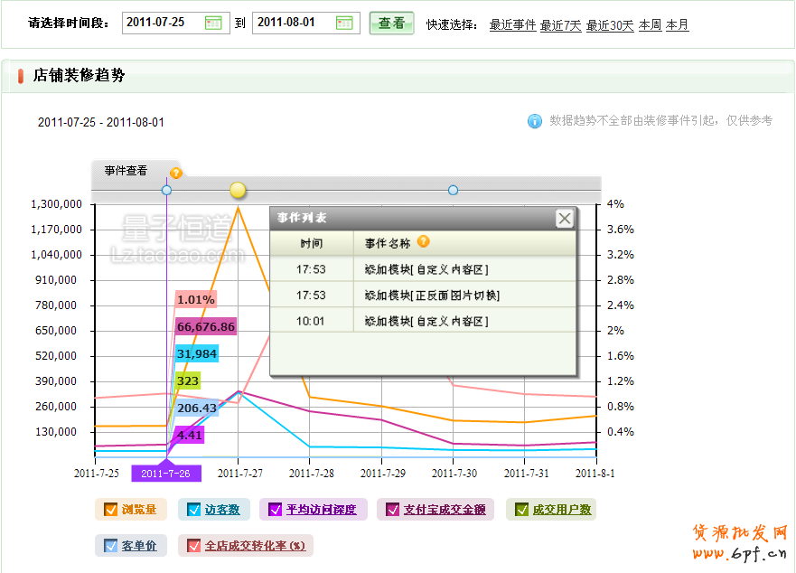 賣家真正關心的成交量,量子統計裝修分析的 7大數據指標助您輕松看出裝修前后的成交量變化,幫助您及時改進店鋪裝修。從圖中我們可以看到,裝修之后瀏覽量和成交金額等都有較大變化。