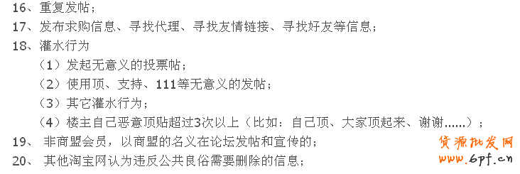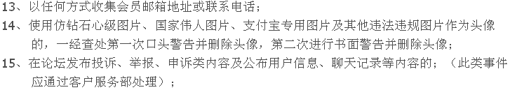 這13之15這三條,我發現大家很容易犯,尤其是15條,很多賣家會把自己遭遇的侵權事發出來尋求解決,而殊不知自己已經違反了版規,淘寶是有專門的處理侵權事件的論壇,大家要找好維權的路,走正確的路才能早點解決完自己的麻煩!!