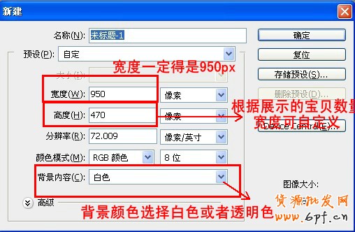新建一張大小合適的圖片。圖片大小:標準版和拓展版寬度都設為950px 高度自定義可以自定義,背景顏色選擇白色或者透明。淘友們可以根據要展示的寶貝數量設置相應的高度,店鋪首頁的產品圖片大小為160*160,比如950*800\950*500看官們可以自由發揮,這里我以我自己店鋪里的模板為例,950*470 如圖: