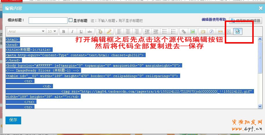 代碼替換之后,我們打開店鋪裝修,在左右兩側各添加一個自定義模塊,我們先編輯左側的自定義模塊,打開編輯框,點擊源代碼編輯,將剛才得到的代碼復制到編輯框中,點擊保存,如圖: