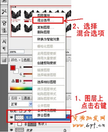 畫好之后,按Ctrl+Enter 調出選區→用填充工具填充為紅色→ 右下角圖層這一欄 → 選擇剛剛編輯的這個矩形點擊右鍵——選擇“混合選項”——將陰影這一欄勾上 然后在陰影上點擊右鍵—— 角度120° 距離大小都填寫2 好了之后點擊確定