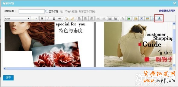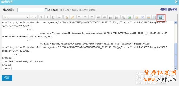 再點擊源代碼的標簽,你做的圖片和鏈接,就到店鋪的后臺去了。到了這一步,你的店鋪裝修也就完成了2/3了,剩下的就是查看效果,修改效果了。點擊保存