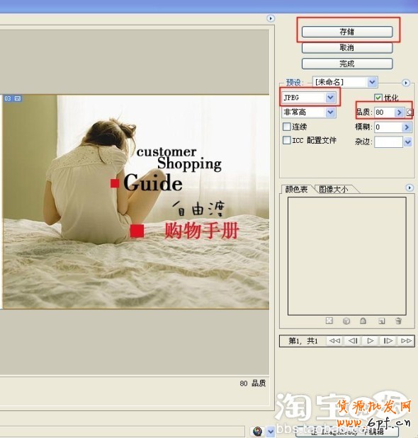 六,存儲。(一)注意事項:一是存儲的格式,在紅色方框的JPEG地方,根據你要的圖片格式來選擇,一般是用JPEG格式的圖。 二是品質問題,從0——100,任意選擇。品質越高,圖片越清晰,一般80到100即可,當然數值越高圖片占用空間越大。