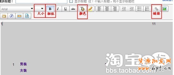 5、其它文字和圖片都可以依次方法輸入,完了就可以點擊保存,你就可以看到你設計的結果了,同時,你認為滿意了就把結果發布到你的店鋪當中吧。在這里你可以設計你想得到的各種形式(當然,一般新手還是多參考一下那些旺鋪的裝修形式),比如說寶貝分類導航、歡迎光臨、店鋪收藏、客服、工作時間、店鋪公告、促銷廣告等等,只要你有想象力,你就能把你的店鋪裝修的像旺鋪一樣漂亮。