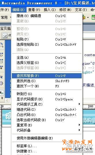 在此圖下方有一個復制按鈕,點擊復制,就會得到寶貝描述_01.jpg圖片的網絡地址。然后在Dreamweaver8.0中點擊“編輯”菜單,并選擇“查找和替換”。