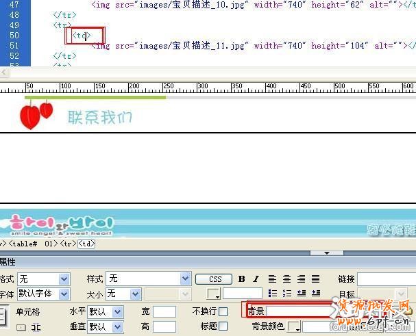 此時可以看到在屏幕下方出現單元格背景框。在背景框內填入images/寶貝描述_11.gif,并在左邊設置寬為740,高為104,設置完畢之后,刪除單元格中的圖片,也即刪除<img src= “images/寶貝描述_11.jpg” width = “740” height = “104” alt=””>這一段代碼。最終如下圖所示:
