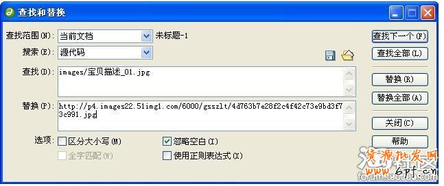 在查找框中輸入“images/寶貝描述_01.jpg”,在替換框中粘貼剛才所復制的寶貝描述_01.jpg圖片的網絡地址。