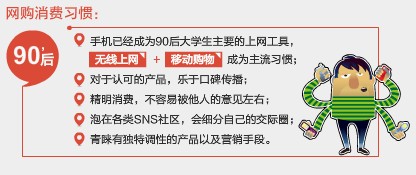 據統(tǒng)計,86%的90后大學生用手機上網,其次才是筆記本和臺式電腦,分別是79%和40%,而中國網民使用移動互聯網的比例僅為66%。無線上網和移動購物成為90后的網購消費主流習慣。因此,要吸引更多的90后,無線端店鋪的運營是賣家們不得不重視的內容。