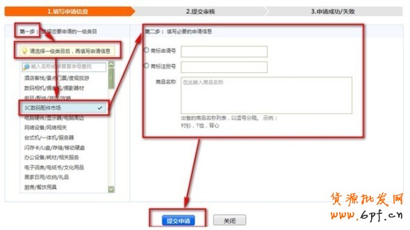 步驟三:選中需要申請的一級類目,填寫好“商標申請號”“商標注冊號”“商品名稱”三項信息