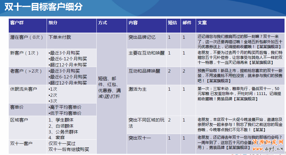 休眠流失的客戶:休眠的客戶可以基于時間這個點來挖掘內容,例如:雙11剛好是我們一百天的相識紀念日,記得回來哦!為了雙11我等了一百天才來通知你,還記得我們一百天前的那次邂逅嗎?