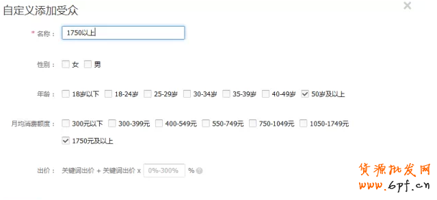 點擊自定義搜索人群,大家會看到5組數據,記住,這里只能選擇5組數據。