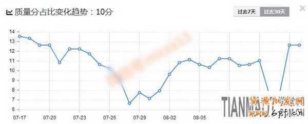 如上圖所示,30天內10分關鍵詞占比整個賬戶的比例呈現一個波浪的形狀。這也是我們經常需要周期性優化直通車的原因所在。同樣,在店鋪爆款的銷量曲線圖中,甚至自然搜索的流量圖中,都會出現這樣的波動。不過若我們發現賬戶的質量分持續走低,長期無法優化上來,那么可以果斷暫停此計劃的推廣2個月以上,以清除失敗且難看的數據記錄。