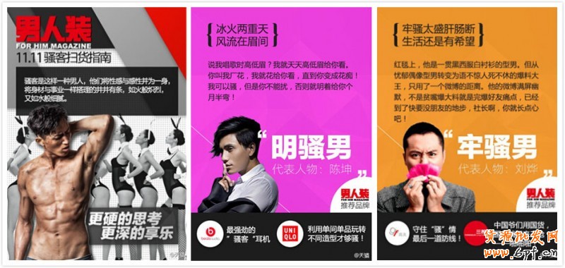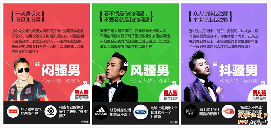 這還不夠,天貓又來個(gè)@男人裝,列出了五種代表性的“騷客”,讓人們來站隊(duì)?騷客出世,潮爆暖男。男生你是哪一種?女生你最愛哪一款?自己站隊(duì),攻略拿好。