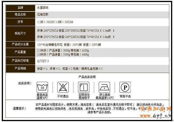 3)商品細節:不少于3張,展示產品各角度、面料、花色、AB版面、支數密度、是否帶床裙、規格,花邊等圖文并茂的信息,同時必須拍照展示吊牌和水洗標。