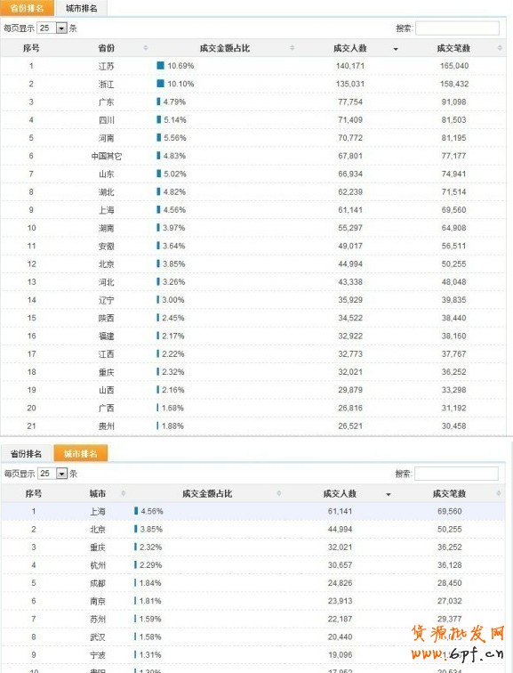 這2張圖,一個是省份,一個是城市。有了這2個數據,我們做直通車或者做鉆展的時候都可以很方便的做好定向推廣。根據這些數據,我們要分析,我們的寶貝是否適合這些地區的買家。舉個例子,比如我們的買家大部分在東北的,但,我們的羽絨服是輕薄的。那么,我們想一下,東北那么冷,輕薄的根本不頂用阿!不只我們這么想,買家是更會這么想,如果我們的廣告投到哪里,我們的寶貝展現給他們看,下單轉化率肯定會很低!所以選款的時候也要考慮地區問題。