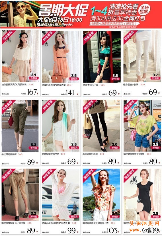 優勢商品先出陣 促銷做陳列,要將最有優勢、最熱賣的商品陳列在最上面。如果你的商品少,一排2~3個陳列,如果商品多,可以3~4個,不要想著盡可能地堆多點。還有,以單品陳列為主,不要設置多級跳轉,把要賣的商品盡可能在一個頁面展示完全。此外,促銷頁面的模塊越簡單越好,描述清晰一些,別讓買家費解,或者自己拿個計算器算到底便宜了多少。