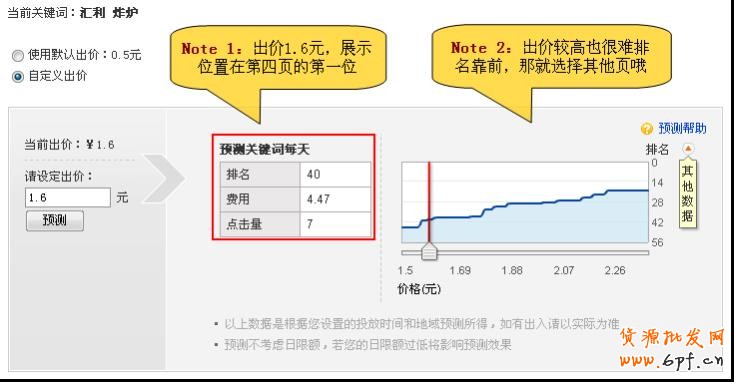哦;我們把出價降到1.6元,排名是40名,展示位在第四頁第一位;出價比較多的,說明這