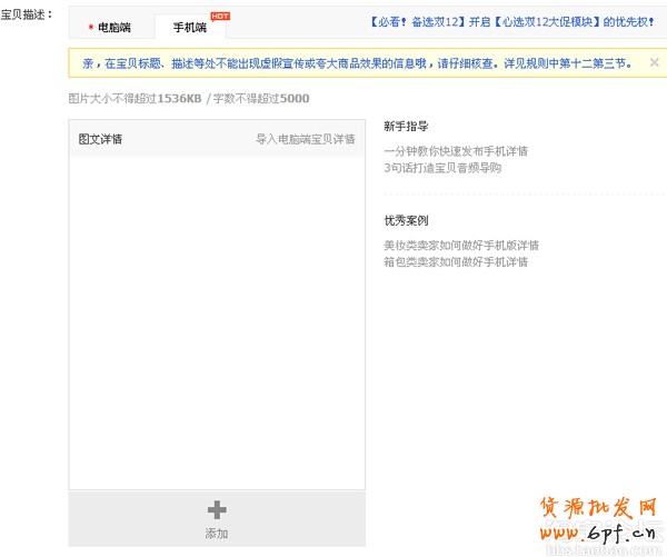 1、內容精簡,重點突出。按照規范上傳手機版寶貝詳情,單個寶貝描述總圖片大小不得超過1.5MB(包含1.5MB),重點突出賣點,優化打開速度與流量損耗;