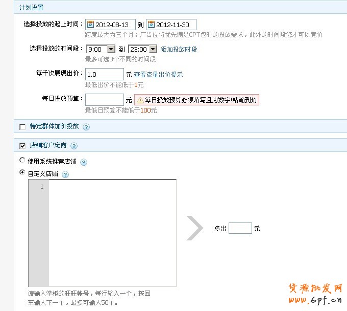 【定向店鋪是100%要的,一般幾乎不適用系統(tǒng)推薦店鋪,自己復(fù)制店鋪來粘貼即可,300個(gè)店鋪分6個(gè)計(jì)劃創(chuàng)建。拉大人群面,增強(qiáng)展現(xiàn)條件】