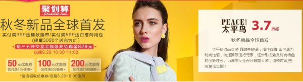 說到聚劃算的鉆展創意,當然大家立刻想到的基本原則是品牌或店鋪Logo、聚劃算logo和簡單的折扣促銷文案,落地頁直接鏈接到聚劃算的品牌團或單品。其實除了以上基本原則,聚劃算的鉆展創意圖在文案、排版和類目特性上有不同的表達。(說明:以下的創意圖案例從創意cool中選取,僅供參考)