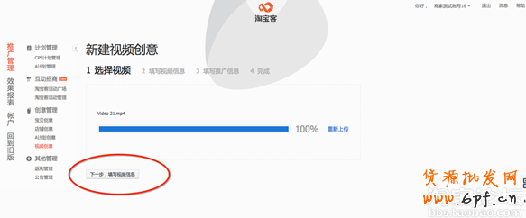 6. 新建視頻創(chuàng)意(上傳完成):視頻上傳完成即顯示100%,選擇“下一步,填寫視頻信息”。