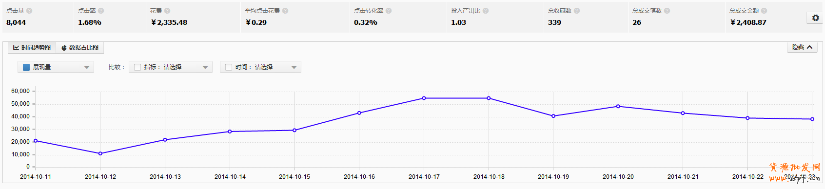 這是10.11重新推廣的數據,前兩天數據還是比較差的,但是第三天的時候,我們重點優化了一款數據較好的寶貝,然后圍繞這款寶貝不斷作優化,因為沒有店鋪基礎,所以成交還不是特別理想,且臨近雙十一,買家更偏向收藏和加入購物車。但是,13天收藏和購物車加起來有700多個,對于一家新店鋪來說還是有一定突破的。而且,數據可以看出,有繼續向好的趨勢,成交趨勢也是如此。