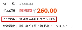 - 買家在寶貝詳情頁面可以看到淘金幣抵扣的優惠提示