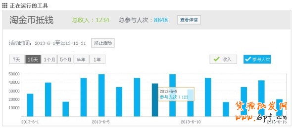 6、在淘金幣賬戶首頁可以查看當前正在運行的淘金幣活動,如果您需要結束抵錢,可以點擊【終止活動】如下圖,如果您需要修改活動設置,請終止活動后重新進行設置,點擊【查看詳情】可以查看更多活動明細:
