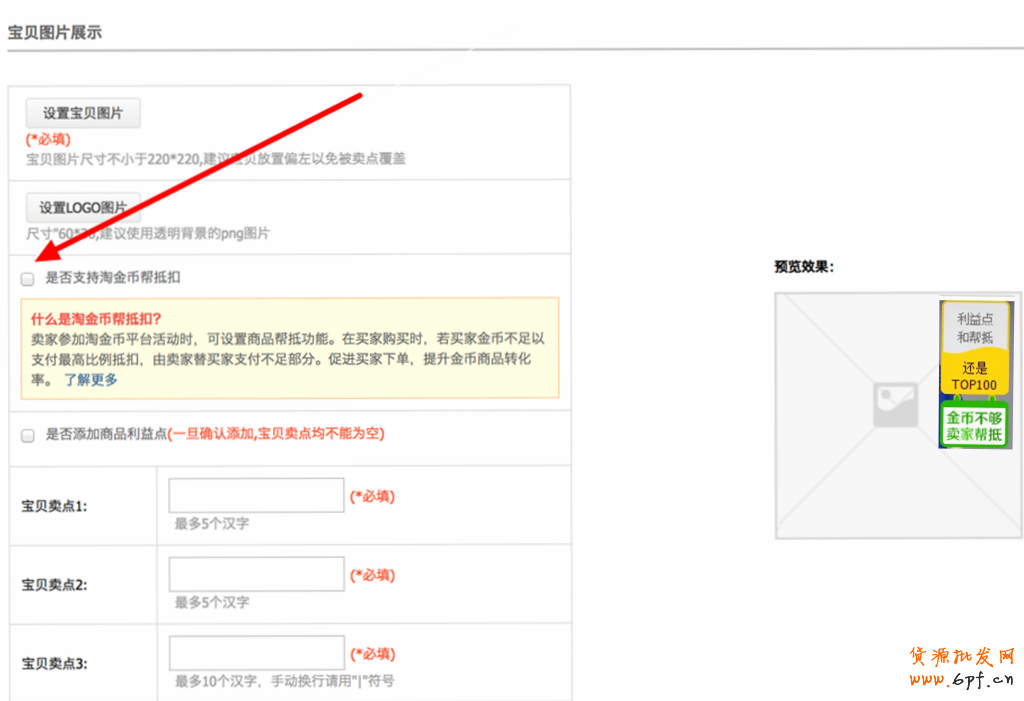 - 在報名商品管理頁面的寶貝圖片展示中選中是否支持淘金幣幫抵扣,勾選并上傳寶貝賣點后會在金幣平臺的寶貝展示中第一時間讓買家看到商品賣家幫抵的標識。