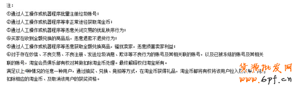 f.對于存在炒信、不良交易、不良注冊、發送垃圾消息、欺詐等不良行為的賬號及其相關聯的賬號,以及已被凍結的賬號及其相關聯的賬號,淘金幣有權對其做扣除淘金幣處理。最終解釋權歸淘寶所有。