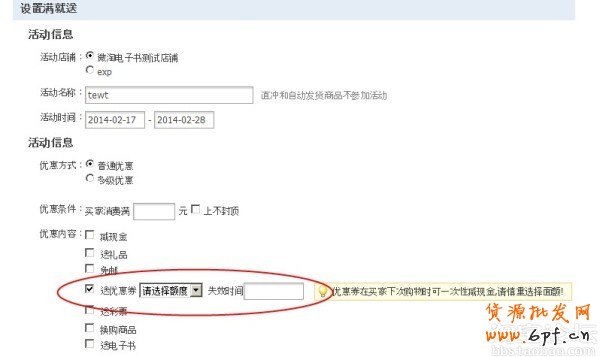 1、滿就送優惠內容增加店鋪優惠券選項;如圖