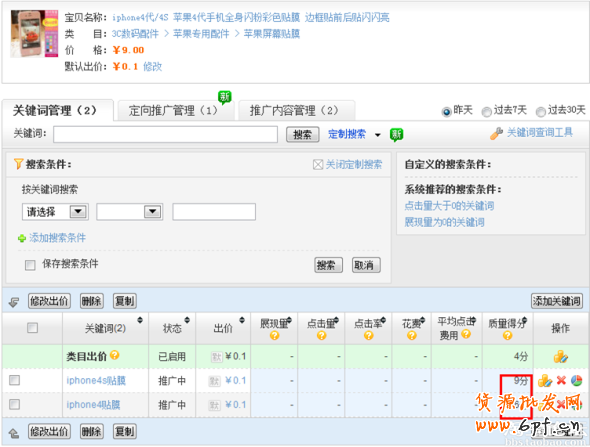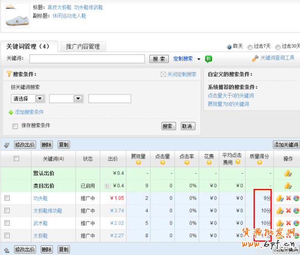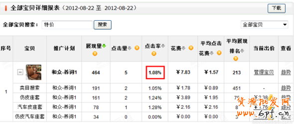當(dāng)一款寶貝的總體點(diǎn)擊率很高,里面的所有關(guān)鍵詞質(zhì)量得分都很高。我用的方法是利用關(guān)鍵詞的點(diǎn)擊率,提升定向的質(zhì)量得分。下面看圖: