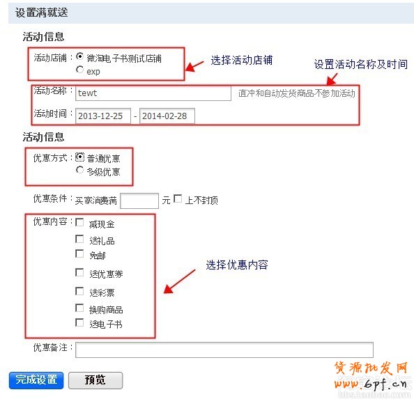 4、根據(jù)提示往下設(shè)置,可根據(jù)需求,設(shè)置多階梯促銷活動(dòng)。多級(jí)優(yōu)惠—最多可同時(shí)設(shè)置5個(gè)不同的主題活動(dòng),促銷方式更多樣化。活動(dòng)設(shè)置完成后,點(diǎn)擊預(yù)覽、完成設(shè)置。