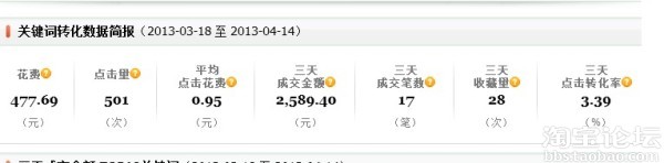 出價高了點擊量有了,但太費錢了,出價低了又排不上名,起不到推廣的 目的,所以我們新人要選擇哪些出價低但成交轉化率高的詞。這就要我們每天不斷的總結分析了,找到最適合我們的詞和價位。我從開頭幾天一天十幾塊錢,到中途的三四十塊,就是因為出價太高,算是失敗吧!