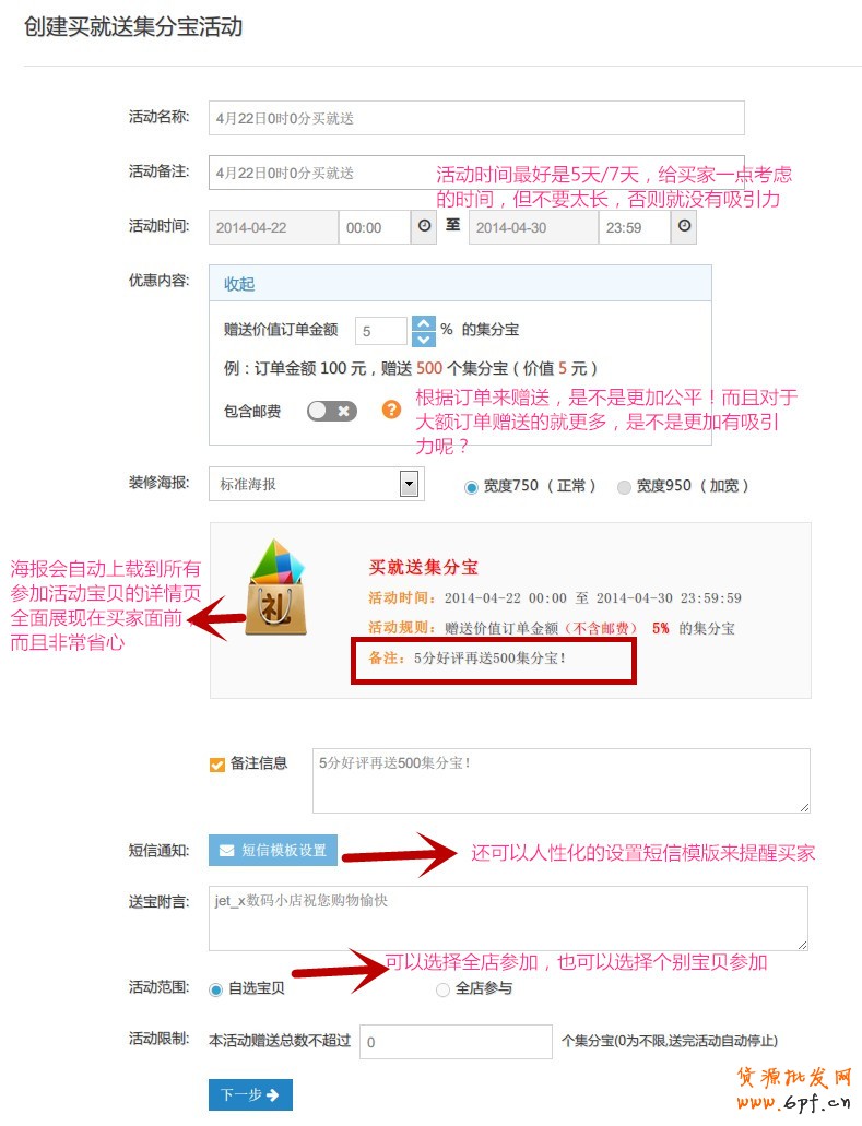 3、贈送集分寶我們可以人性化一些,根據訂單金額來贈送,一來對于下大額訂單的買家是不是更有吸引力呢?二來如果小額的訂單我們送多豈不是要虧了?所以根據訂單金額來贈送是最人性化了。