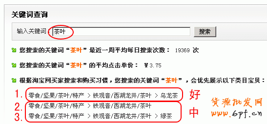 我們以“茶葉”為例總共出現3個類目,那么第一個類目才是好的類目,第2.3個類目相關性就是中,各位掌柜請按照個人的寶貝選擇合適類目放置,關鍵詞查詢頁面只是提供一個參考。
