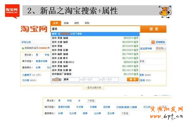 卡住搜索。在淘寶的搜索框輸入想賣的寶貝關(guān)鍵字,比如輸入童褲,會出來這么多的關(guān)鍵字(如下),這能說明淘寶買家正在找什么,另外,頁面下面的屬性也很重要,如果選擇的屬性和題目設(shè)置的一樣,標題的質(zhì)量評分就會高,在搜索時,排名就會相對靠前。