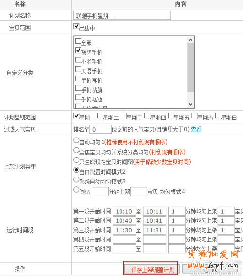 把上面分配好的上架時間按分類一個個定時上架安排好后保存即可。以后有新上架的只要加到計劃里面就好,只要不刪除計劃,都會按照計劃下架后自動上架。