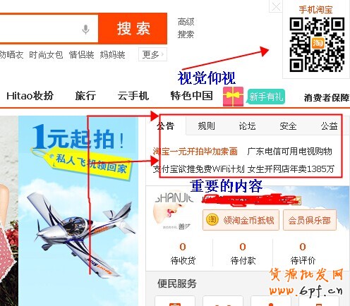 解釋:何為”視覺F原理“就是一個人視覺的一種趨勢習慣 就是我們去點開一個頁面的時候會首先第一視覺是右邊或者左邊平視的位置 然后才會選擇去俯視或者仰視 這個是指視覺上的 你們可以去測試一下 因為人的本能心里 所以很多地方用到了”視覺F原理“ 例如淘寶首頁也是一樣 所以淘寶規則 重要公告都會出現在F的那個點上 是因為大家進去以后會情不自禁的看過去,所以店鋪也需要 。