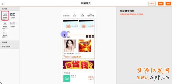 把左側的搭配拖動到中間預覽頁面上即可,系統會自動調取店鋪已經使用的搭配套餐進行前臺展現。