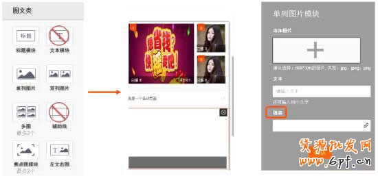 在界面左側選擇組成模塊類型,中間模擬手機進行實時預覽,右側編輯模塊內容。總共有14個模塊可供選擇,首頁至多可添加12個模塊。