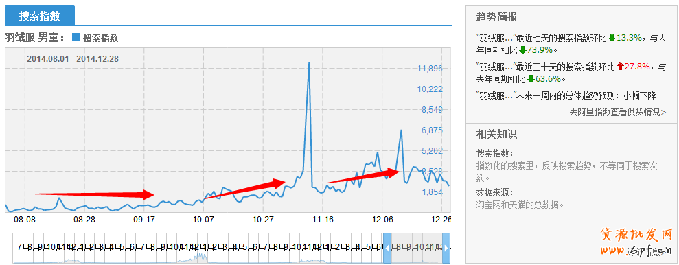 根據(jù)淘寶指數(shù)的數(shù)據(jù)我們可以看到,該類目在8 、9月份指數(shù)是比較低的,主要是季節(jié)性的影響,到了10月份隨著天氣逐漸變化以及雙十一前的預(yù)熱期,整個(gè)行業(yè)開始呈現(xiàn)流量的上升趨勢,到了雙十一是迎來整一年的流量高峰期,而由于羽絨服的旺季,其實(shí)是從11月份開始,總體平均是在12月份比較高,因此在11月份尾到12月中,羽絨服也會(huì)迎來整一年的平穩(wěn)高峰期,而過了雙十二之后,總體的流量開始出現(xiàn)下滑,之后就穩(wěn)定發(fā)展,而到1月份后,賣家的清倉季又開始了。