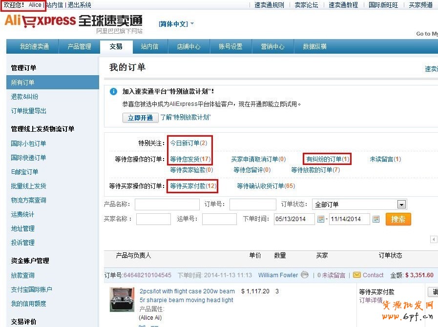 問題:1、今日新訂單:每天關注今日新訂單,然后計劃安排發貨,發貨要注意什么?2、有糾紛的訂單:客戶不滿意就提起糾紛,速賣通老是偏袒買家(去年很多規則是對賣家極為不利的,我的好幾個客戶速賣通把款退給了買家,其中有兩個客戶后來又把款通過西聯還給我了),怎么辦呢?3、等待買家付款:分析客戶下單情況,有沒付款,如果跟進,這個可比做外貿回詢盤帶勁多了,一來二去就成交了,可是有些客戶不付款,回信息卻了無音訊,怎么辦呢?