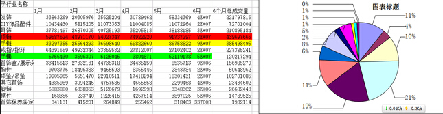 而標紅出來給大家看到的高質寶貝數,則是代表在淘寶上屬于飾品類目,而沒有造成銷售滯銷的寶貝。所以把去年6個月的數據下載到excel表格,進行分析之后,我們會得到這樣的數據表格: